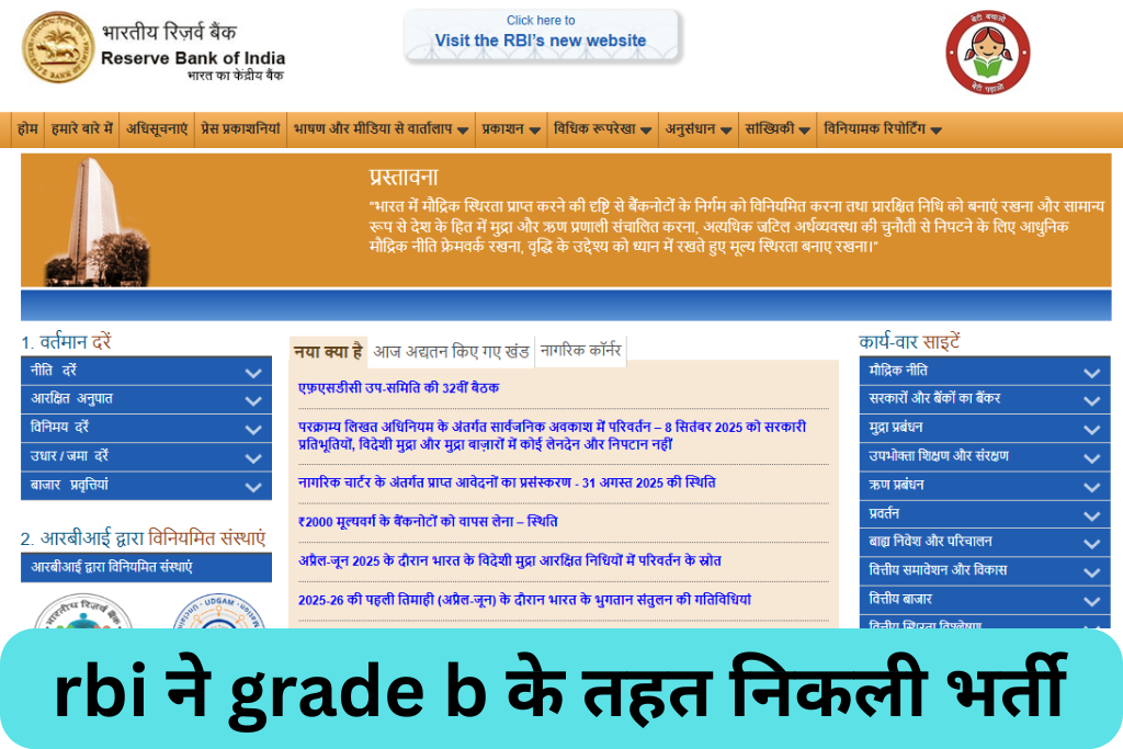 RBI RECRUITMENT 2025:सरकारी नौकरी की तैयारी कर रहे युवाओं के लिए खुशखबरी है भारतीय रिज़र्व बैंक (RBI) ने ग्रेड B अधिकारियों के पदों पर भर्ती का नोटिफिकेशन जारी कर दिया है. इस भर्ती अभियान के तहत कुल 120 पदों पर नियुक्ति की जाएगी, खास बात यह है कि इन पदों पर चुने गए उम्मीदवारों को आकर्षक वेतन पैकेज मिलेगा, जिसकी शुरुआती सैलरी एक लाख रुपये से भी अधिक है यह अवसर उन सभी उम्मीदवारों के लिए सुनहरा मौका है जो बैंकिंग क्षेत्र में करियर बनाना चाहते हैं और RBI जैसी प्रतिष्ठित संस्था में नौकरी का सपना देखते हैं.